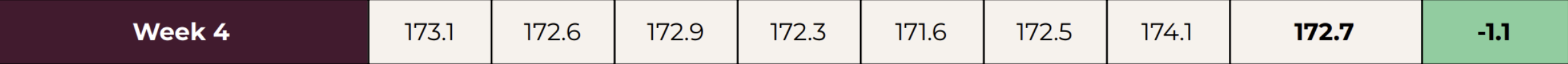 On week 4, the starting weight for the week was 173.1 and the ending weight was 174.1. Based on this, you might assume that you gained a whole pound that week.