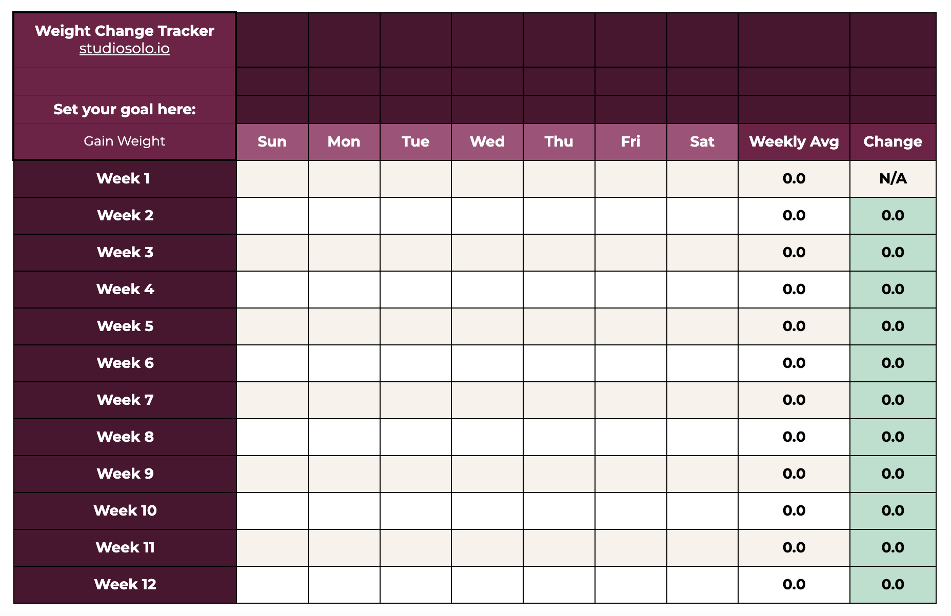 The spreadsheet used in my personal training is also linked here as a free resource for you. Input your daily weigh-ins: it will automatically track the average and show your gain or loss per week